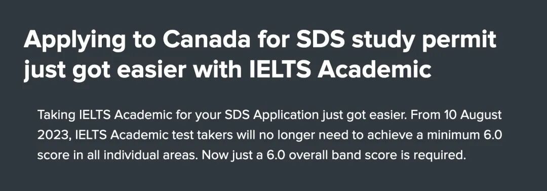 根据雅思官网消息,加拿大移民局IRCC将从8月10日起放宽SDS学签申请人的语言要求。 8月10日后提交学签申请,学术类雅思只要总分达到6.0。 例如,如果口语和写作成绩为 5.5,阅读和听力成绩为 6.5,则总分将为 6,将有资格通过 Student Direct Stream (SDS) 申请加拿大学习签证。 加拿大移民局近日宣布,从2023年8月10日起,通过SDS通道申请学生签证时,可以接受4个全新的英语测试成绩。在这之前,申请人尽可通过考取雅思成绩来申请SDS通道! 新增的4个英语考试分别是: CELPIP General CAEL PTE Academic TOEFL iBT Test 加拿大学签首签分四种类别:中小学计划、高等教育计划、普通学生计划、 SDS计划。 1️⃣中小学计划 申请加拿大中小学的(包括参加高考后来加拿大读预科的),都可以走中小学计划。这个类别的申请要求比较简单,不需要提交雅思成绩,资金方面以一年大学学费的收据和GIC(存1万加币专款专用于留学生活)为主,不用12个月存单或税务证明。 2️⃣高等教育计划 高等教育计划是加拿大移民局于几年前为了方便就读post-secondary课程的学签申请人办理签证申请而推出的一个学签通道。其优势在于,没有雅思6分的要求,同时又可以通过支付首年学费和存1万加元的GIC来简化资金材料。因而推出之后收到很多留学生朋友的青睐。 3️⃣普通学生计划 普通学生计划:不想购买这个1万加币的GIC“理财产品”的学生,并且雅思成绩也达不到四个6分,就只能选择普通学习计划(普通学生签证)。 4️⃣SDS计划 SDS计划于2012年4月颁布,是留学生赴加签证利好政策。 SDS的全称是Study Direct Stream,即“学习直入计划”。该计划进一步拓宽了学生语言成绩要求和学校录取的范围,为具备一定的语言能力(英语或法语),并即将进去合格的加拿大学院或大学就读的学生,提供的一个便捷,快速的申请通道。 近日,加拿大移民部(IRCC)更新移民部长指示:将加快处理学生直达通道(SDS),对来自中国、印度、菲律宾等14个国家的留学生学签申请“优先处理”,即缩短处理时间,确保他们更快开启留学生活。 SDS计划最大的优势就是申请学生签证的速度快,所有符合条件的学签申请将在20天内进行审核以发放签证。 在选择留学院校的时候,如果未来是打算回流就业,那最好优先选择排名比较靠前的院校;如果是想留在加拿大,在选择院校的时候,可以优先选择方便在加拿大就业的专业,以及考虑你未来想要定居的城市。 加拿大统计局的研究发现,与具有相似语言背景和加拿大工作经验的申请人相比,具有加拿大学习经验的申请人在第一年的收入稍低于没有加拿大学习经验的申请人,因为他们在最初几年更倾向于继续深造。 但从长远来看,加拿大学习经历的好处是显而易见的。随着经济移民更多地在加拿大劳动力市场工作,移民加拿大前的经历在影响收入方面变得不那么重要。移民十年后,曾在加拿大留学的经济移民收入高于没有加拿大留学经历的人。 加拿大统计局解释说,加拿大学习机构的教育为移民提供了适合加拿大劳动力市场的高质量职业技能,并提高了他们融入加拿大经济和社会社区的能力。 从加拿大指定教育机构(DLI)毕业的国际留学生可以获得一辈子只能拿到一次的毕业工签(PGWP)。 与封闭工签不同,PGWP是开放工签,不和特定雇主绑定,也就是说毕业工签有效期间可以随意更换雇主,直到寻找到满意的工作为止。 但毕业工签的期限通常是不可延长的,其有效期取决于国际毕业生完成的教育计划时长,最长三年。 加拿大的毕业工签一直是国际学生拿到永居身份(PR)的完美跳板。拿到毕业工签的那一刻,就等于开辟了多条移民之路。 根据加拿大统计局发布的数据显示,毕业5年内,持毕业工签获批PR的成功率高达75%!而且,近年来加拿大移民政策和移民项目在不断的向有本地经验的申请人倾斜。